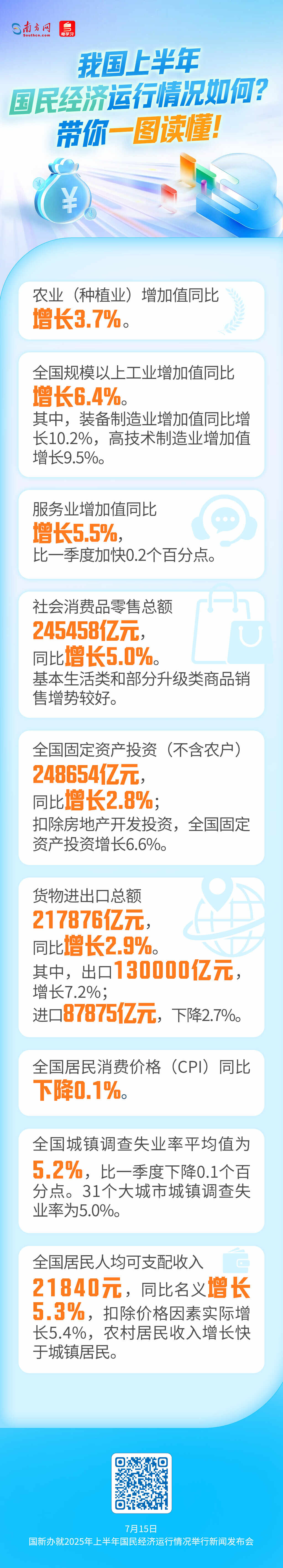 7月15日,国新办就2025年上半年国民经济运行情况举行新闻发布会(直播回顾)。据介绍,上半年,国民经济迎难而上、稳中向好。初步核算,上半年国内生产总值660536亿元,按不变价格计算,同比增长5.3%。