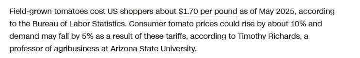 美国劳工统计局的数据显示,截至今年5月,田间种植的西红柿在美国每磅售价约为1.7美元(约合每公斤26.8元人民币)。亚利桑那州立大学教授蒂莫西•理查兹表示,征收关税后,美国番茄价格可能上涨10%左右,而需求可能下降5%。