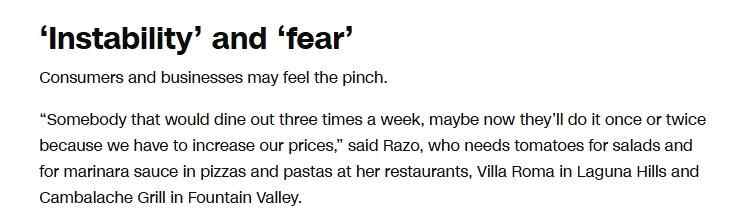 拉佐告诉记者,她现在正试图从美国国内种植者那里采购番茄,但如果不能尽快找到合适的美国替代产品,她可能不得不提高自己的菜单价格,而这将让那些“原本每周来就餐三次的人只来一两次”。