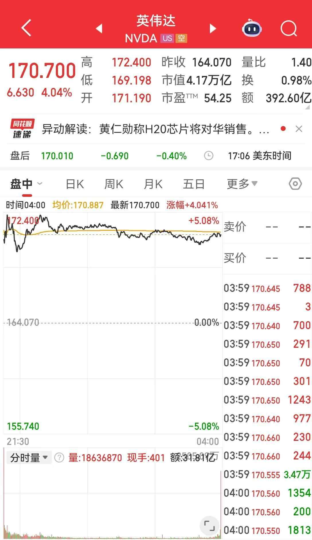 消息面上,推动纳指上涨的主要动力来自英伟达,该股当日上涨4%,最新市值约4.17万亿美元,其市值一夜增加1618亿美元(约合人民币11605亿元)。此前,英伟达在官网发文称,公司将恢复H20在中国的销售。