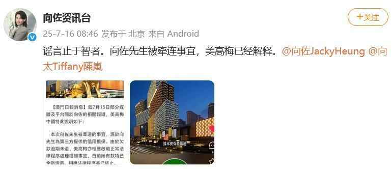 向佐工作室官方账号“向佐资讯台”晒出2张截图写道:“谣言止于智者。向佐先生被牵连事宜,美高梅已经解释。”