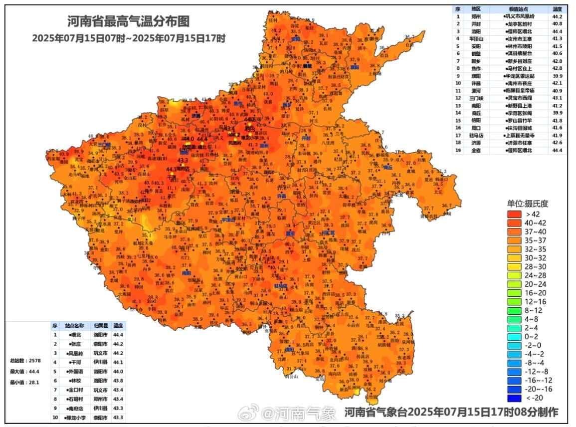 据河南气象,7月15日7时至17时,河南省大部出现37℃以上高温天气,局部40℃到44℃,其中高于40℃的有111个县(市、区)共481站。国家气象站最高气温前3站分别为:荥阳41.9℃、偃师41.6℃、伊川41.5℃;区域站最高气温前3站分别为:偃师区喂北44.4℃、荥阳市张庄44.2℃、巩义市凤凰岭44.2℃。