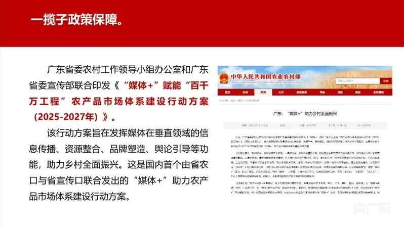主题发言中,张璐介绍了广东在全国首个推出的“媒体+”系统性、常态化工作机制——《“媒体+”赋能“百千万工程”农产品市场体系建设行动方案(2025—2027年)》。这个行动方案旨在指导媒体在农产品市场营销、品牌建设领域发挥公信力及智库、传播、创意等功能,助力乡村全面振兴。