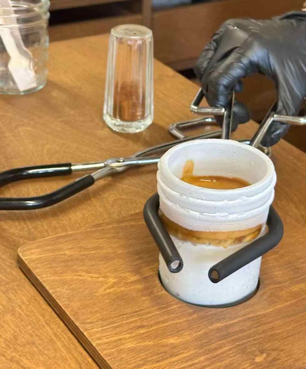 记者在视频中看到,制作过程颇为讲究:杯子需提前冷冻至零下80℃,操作时店员需用专门的夹子取出。随后冰牛奶被倒入杯中,接触杯壁瞬间结冰,再倒入热浓缩咖啡,冷热碰撞,苦甜分明。店员提醒,最佳饮用时间是在制作完成后40秒内,以保留风味。