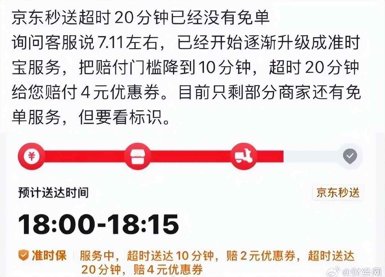 客服称,当前商家自送订单仍可能享受超时免单,超时后平台会自动触发。而京东骑手配送订单均已投保“准时宝”,超时后按保险规则赔付优惠券,不再直接免单。