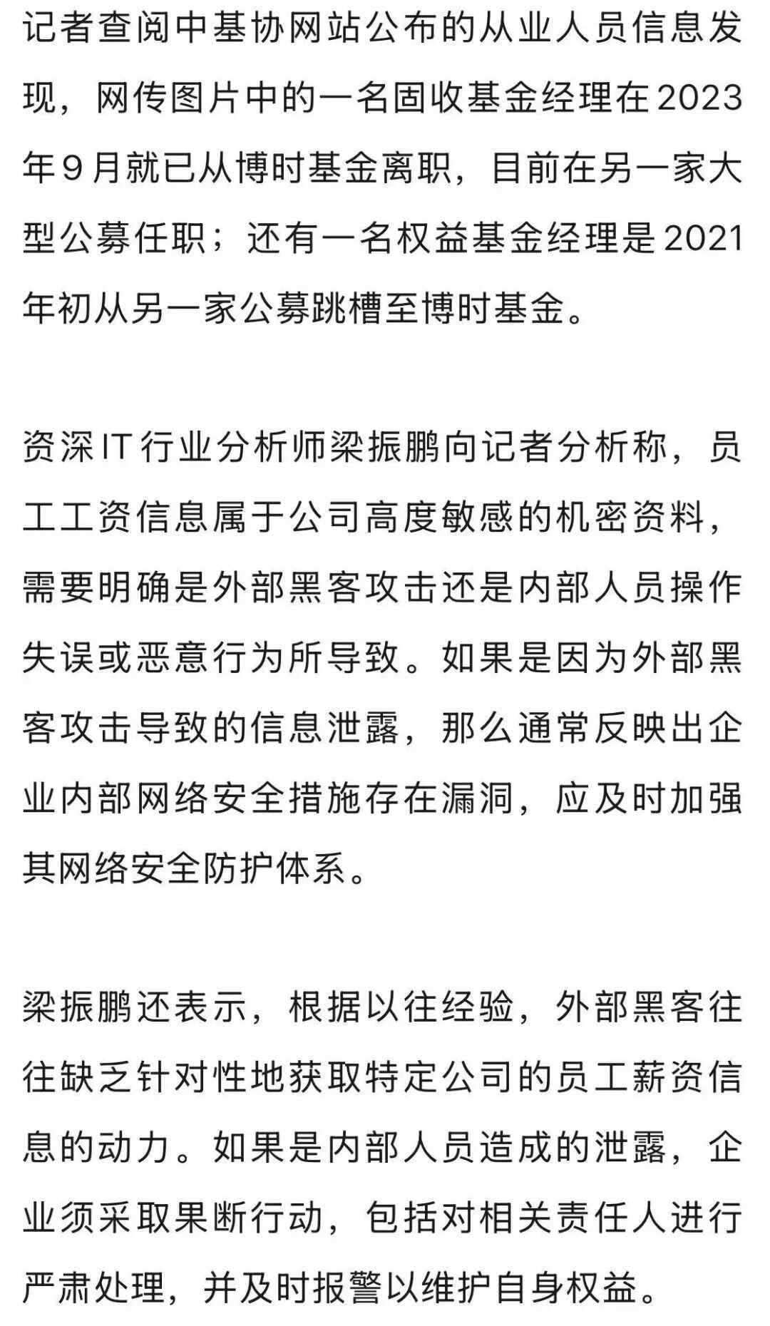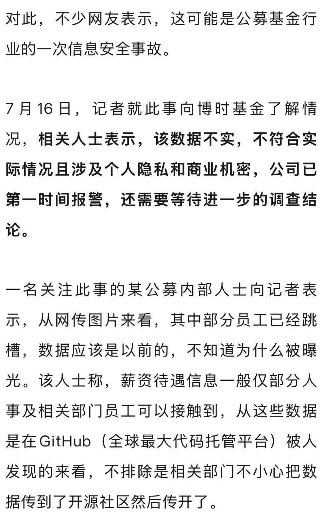7月16日消息,近日,一则“博时基金数据库疑似泄露,员工工资曝光”的消息刷屏。从曝光内容来看,涉及从固收、权益到财务、信息等部门数十名员工的工号、姓名、职级、月薪等情况,其中月薪最高为13.5万元。还有一张网传图片列出了一部多名员工的年终奖明细,奖金最高的为610万元,最低为49万元。