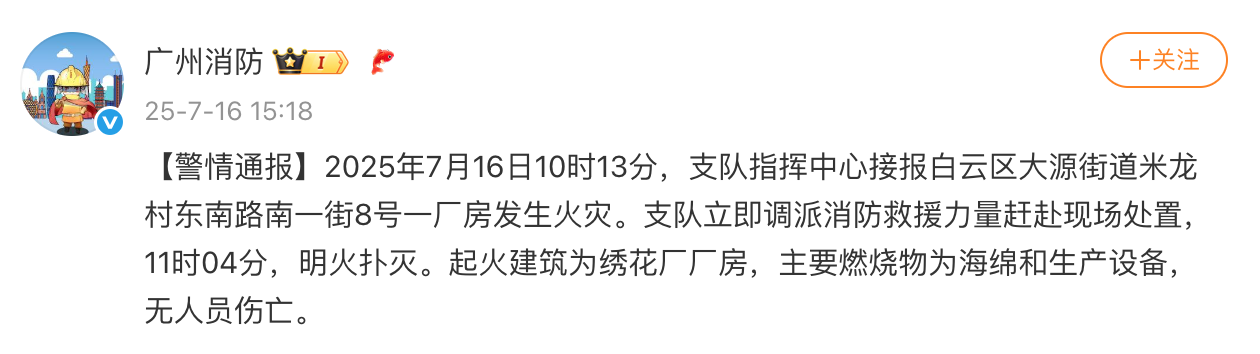 广州消防警情通报中指出,7月16日10时13分,支队指挥中心接报白云区大源街道米龙村东南路南一街8号一厂房发生火灾。支队立即调派消防救援力量赶赴现场处置,11时04分,明火扑灭。起火建筑为绣花厂厂房,主要燃烧物为海绵和生产设备,无人员伤亡。