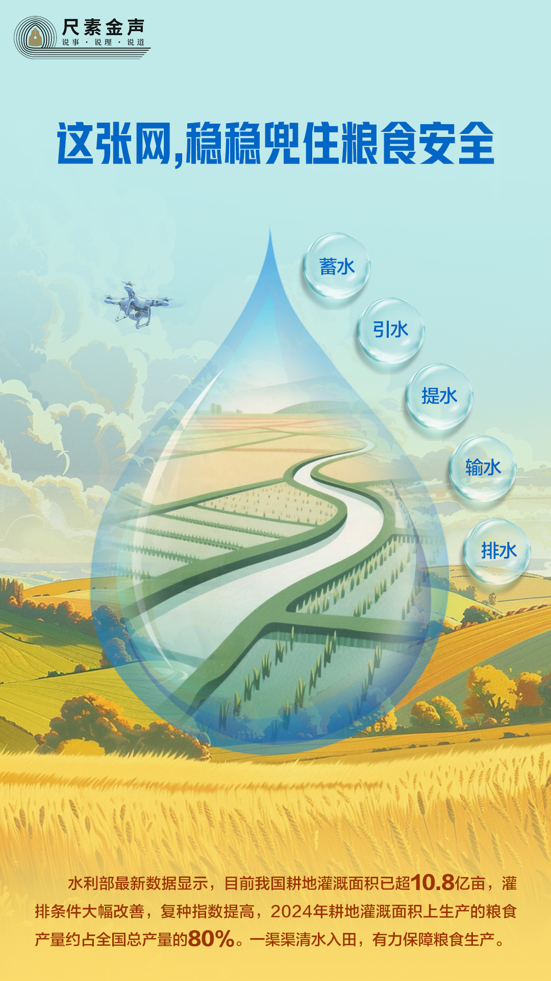 有收无收全在水。让汩汩清水蓄得足、引得出、流得畅,让广袤耕地“喝”上水、“喝”饱水、“喝”好水,端稳端牢中国饭碗就有了更加坚实的基础。