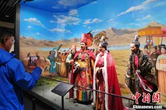 7月15日,在位于西藏拉萨的西藏博物馆,文成公主进藏的《柏海迎亲》塑像吸引观众。