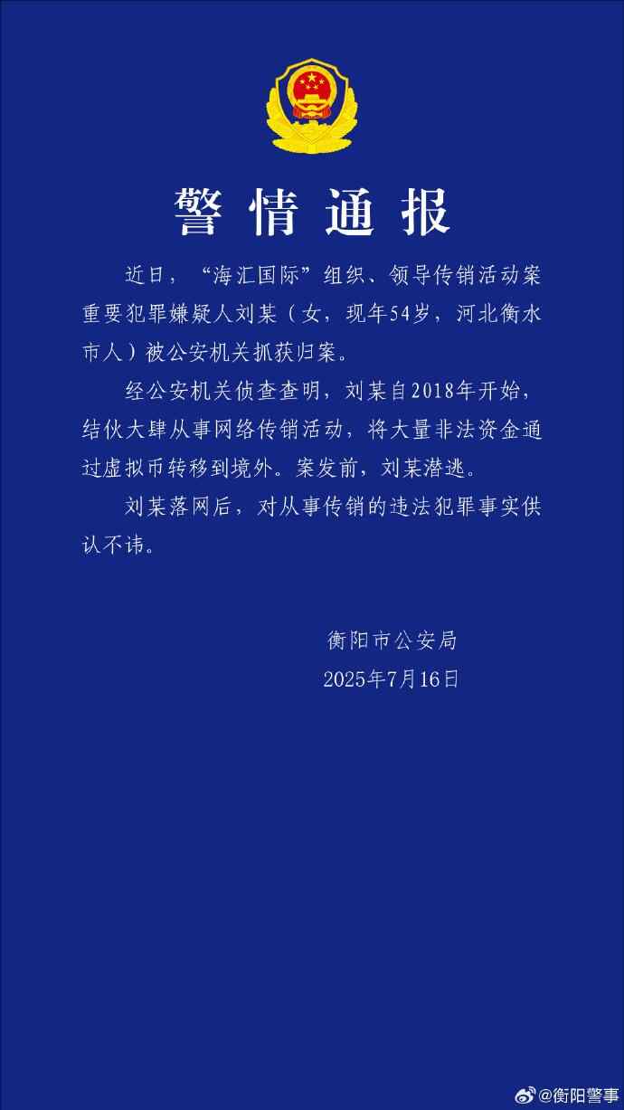 随着“海汇国际”传销团伙中国境内总负责人刘某被抓获归案,“海汇国际”组织、领导传销活动案侦办工作再获重大进展。