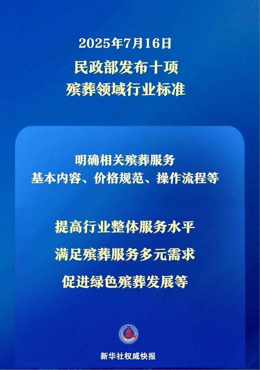 民政部介绍,制修订系列标准,是回应民生关切、规范市场秩序、推动行业高质量发展的重要举措,为监管部门查处违规行为提供了明确依据,有助于进一步规范相关殡葬服务,促进绿色殡葬发展,助力保障逝有所安、丧有所尊、思有所依。