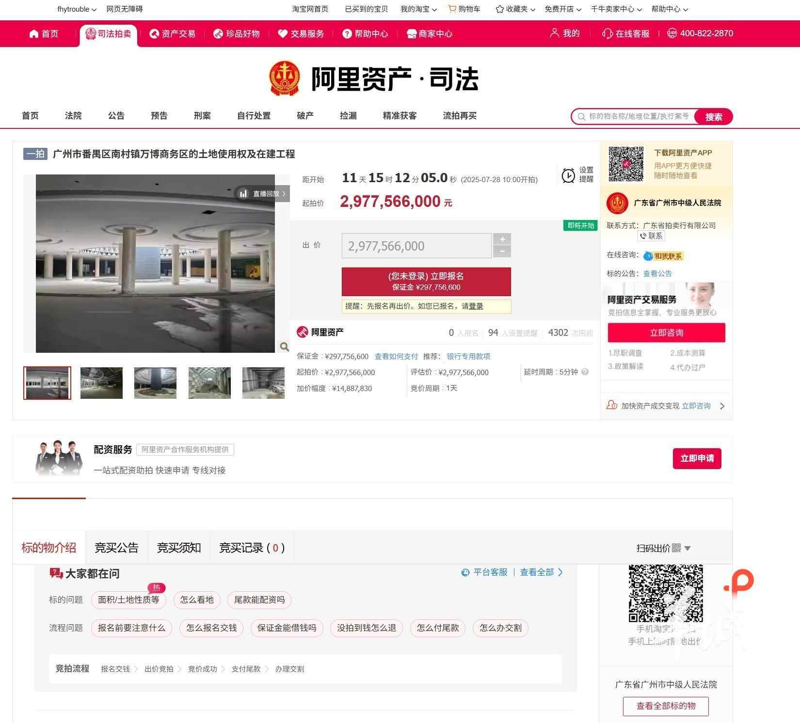 近日,阿里资产司法平台上架一宗拍卖标的,广州番禺南村万博商务区土地使用权及在建工程将于7月28日开拍,起拍价约29.78亿元。