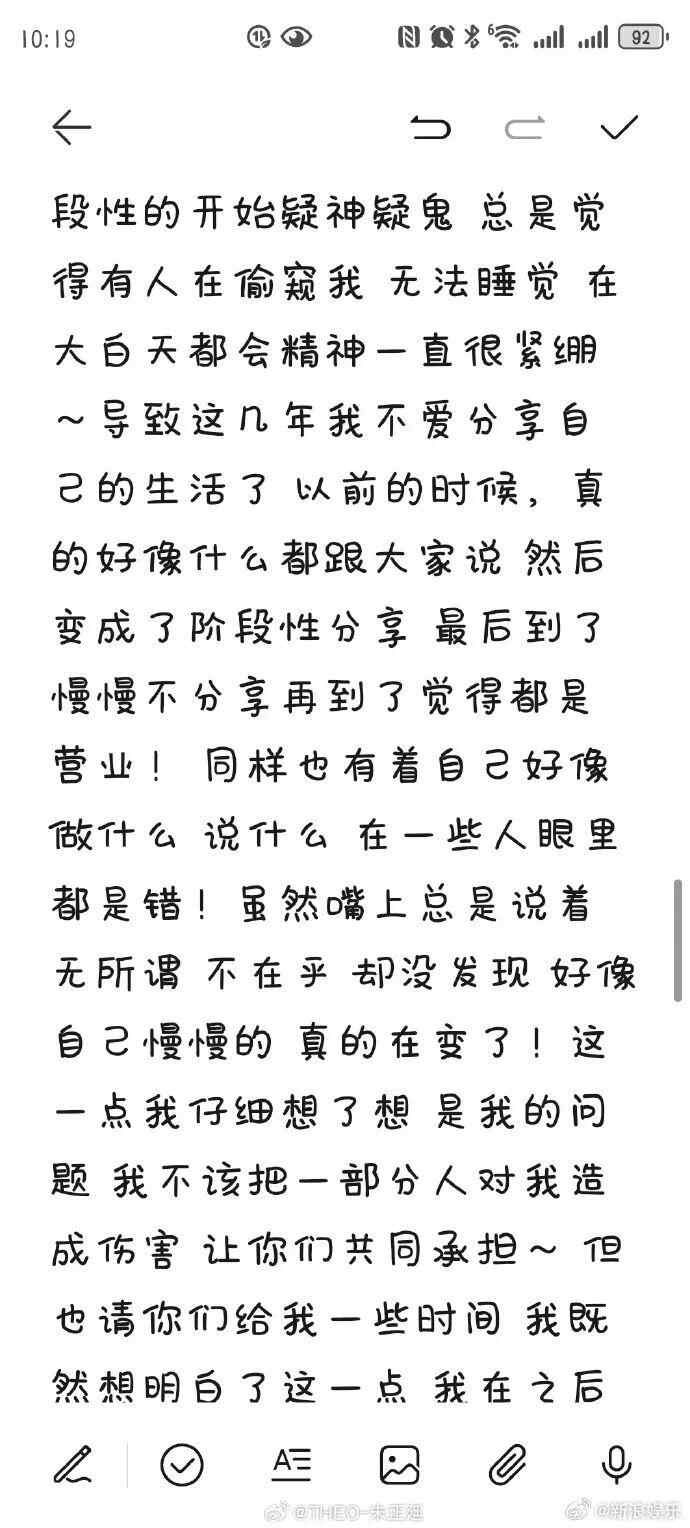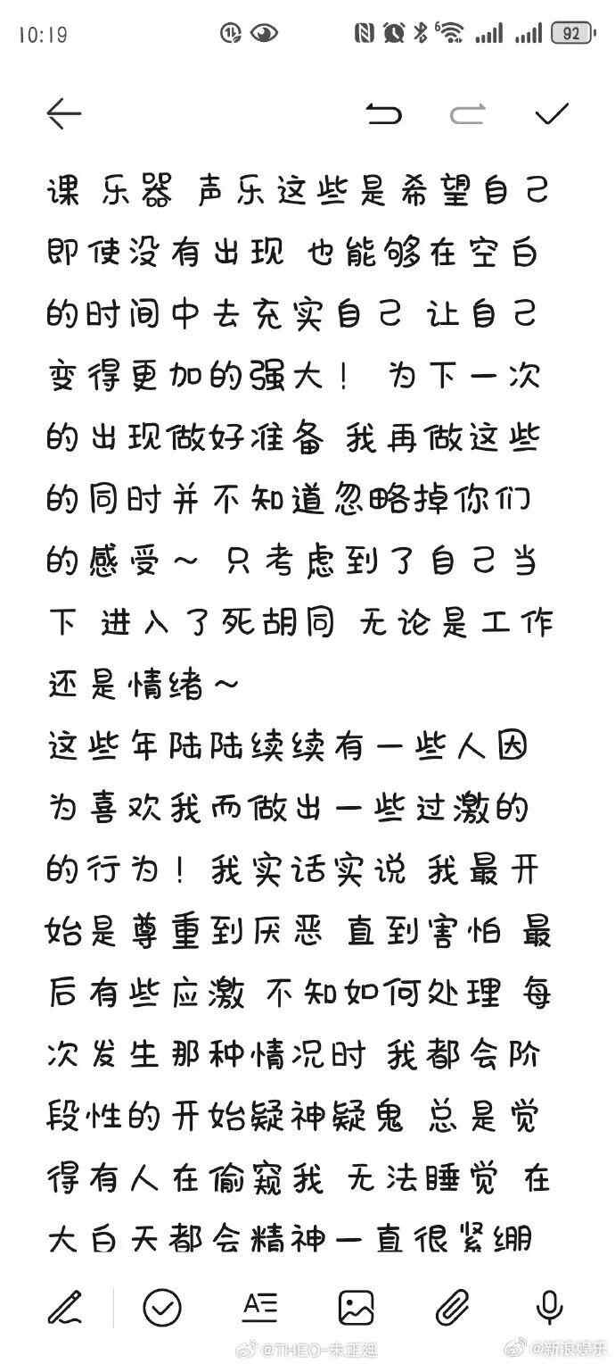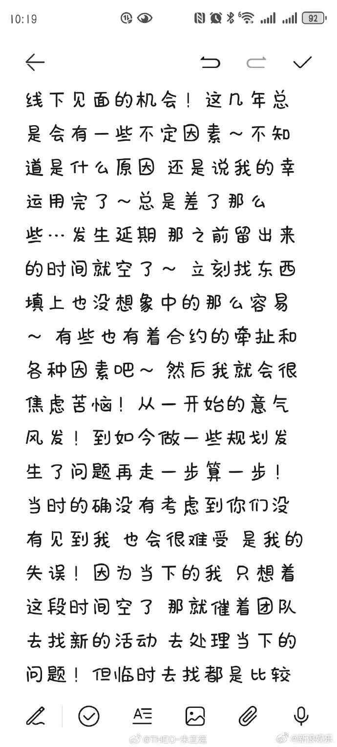 稍晚,他在超话给粉丝写长信道歉,他称已经换了好几次团队,也理解粉丝对团队有些气愤:“他们都认,也都在努力”;出现一些不可控的情况时自己也会焦虑、情绪出现问题,所以一直在空白的时间里充实自己。