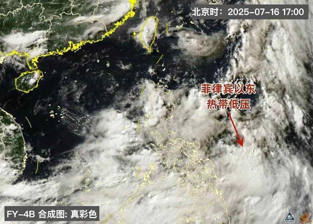 根据中央气象台观测,菲律宾以东热带低压,16日17时中心位于菲律宾马尼拉偏东方大约1020公里的太平洋洋面上(北纬14.0度、东经130.4度),中心附近最大风力6级(12米/秒),中心最低气压为1002百帕。