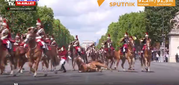 从现场视频可以看到,当骑兵方阵行进至香榭丽舍大街时,有一匹战马突然脱缰离队,而另一匹马则当街倒地,引发现场混乱。
