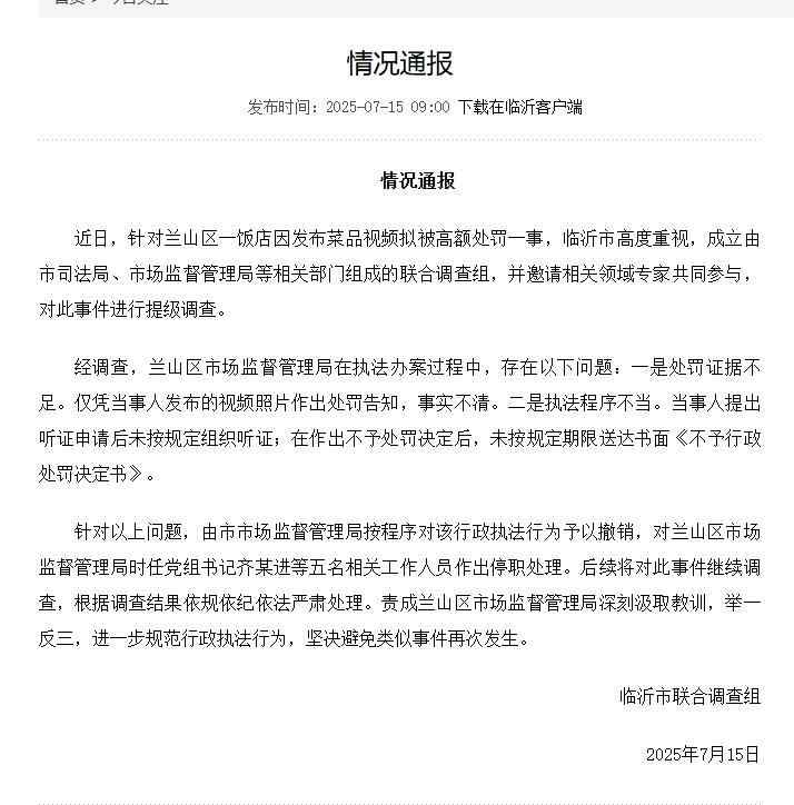 近日,针对兰山区一饭店因发布菜品视频拟被高额处罚一事,临沂市高度重视,成立由市司法局、市场监督管理局等相关部门组成的联合调查组,并邀请相关领域专家共同参与,对此事件进行提级调查。
