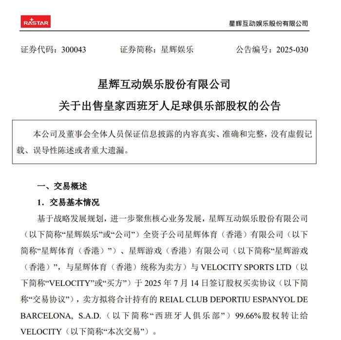 作为西班牙人足球俱乐部的最大股东,星辉娱乐7月14日晚间发布公告,拟出售所持有西甲联赛球队西班牙人99.66%股权,买家为英超球队伯恩利老板。