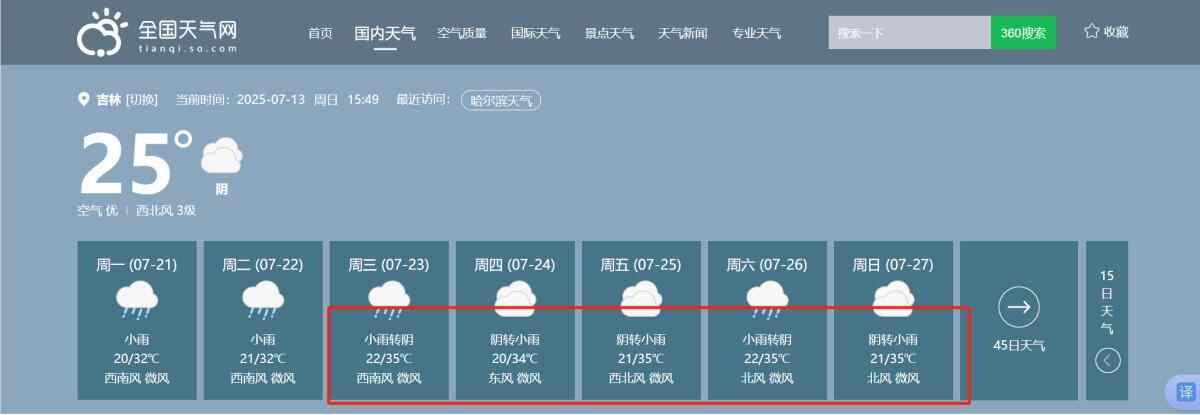 气象预报显示,未来一周内,哈尔滨气温在20摄氏度至29摄氏度之间,同时还伴有持续的降雨天气,温度有所下降,但到了下下周,7月23日至27日,哈尔滨再次迎来高温天气,连续四天的最高气温都是34摄氏度。对比看,吉林省吉林市情况接近。