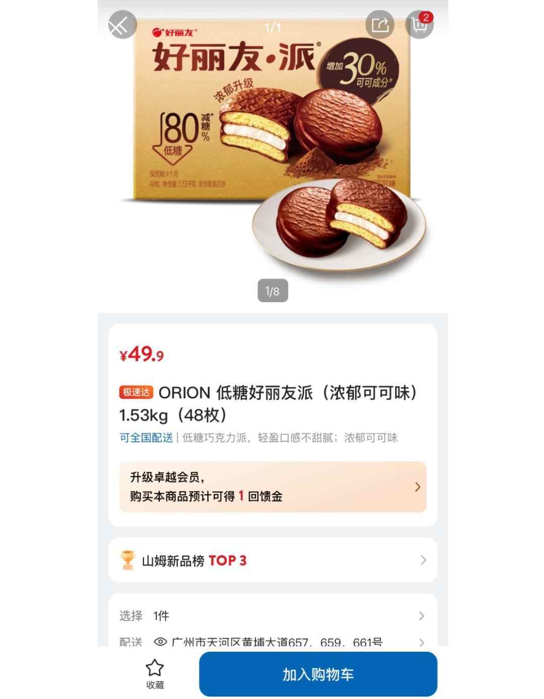 社交媒体上被质疑的“低糖好丽友派”,于今年6月在山姆上新。新品在原有配方上进行了创新,减少了80%的糖分,同时增加了30%的可可含量,售价为49.9元一盒,内含48枚。