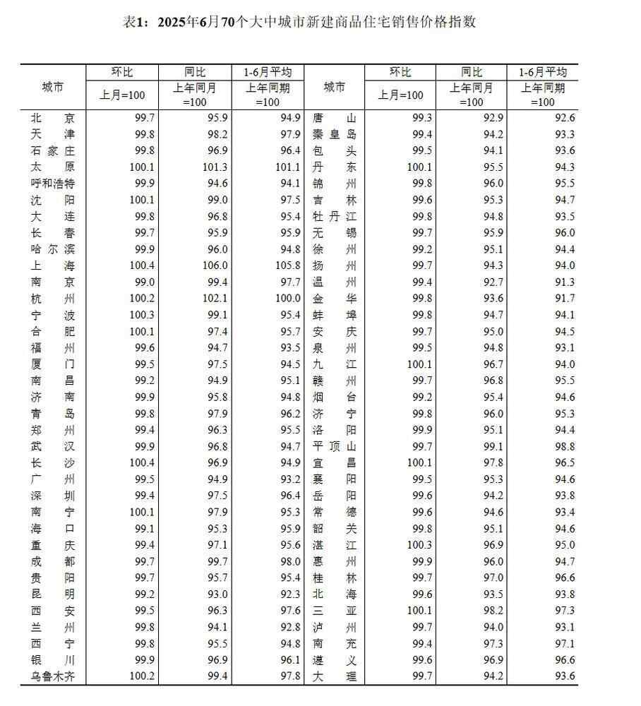 一线城市新建商品住宅环比下降0.3%,同比下降1.4%,同比降幅较上月收窄0.3个百分点。其中,上海同比上涨6%,环比上涨0.4%,北京、广州和深圳同比分别下降4.1%、5.1%和2.5%,环比分别下降0.3%、0.5%和0.6%。广州市新建商品住宅上半年平均价格指数较2024年同期水平下跌6.8%。