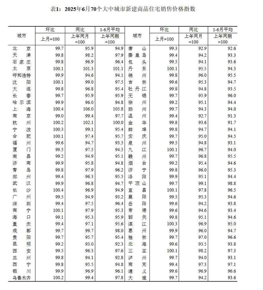 一线城市新建商品住宅环比下降0.3%,同比下降1.4%,同比降幅较上月收窄0.3个百分点。其中,上海同比上涨6%,环比上涨0.4%,北京、广州和深圳同比分别下降4.1%、5.1%和2.5%,环比分别下降0.3%、0.5%和0.6%。广州市新建商品住宅上半年平均价格指数较2024年同期水平下跌6.8%。