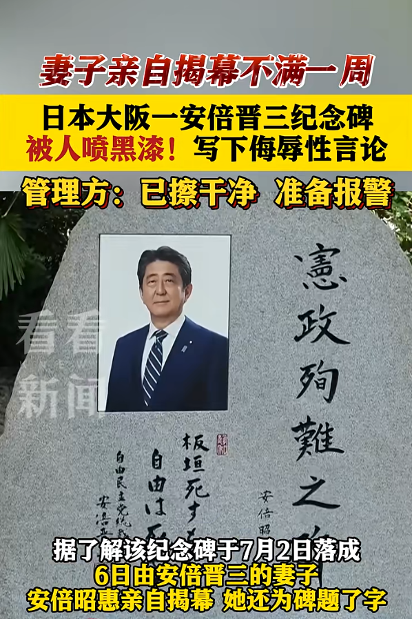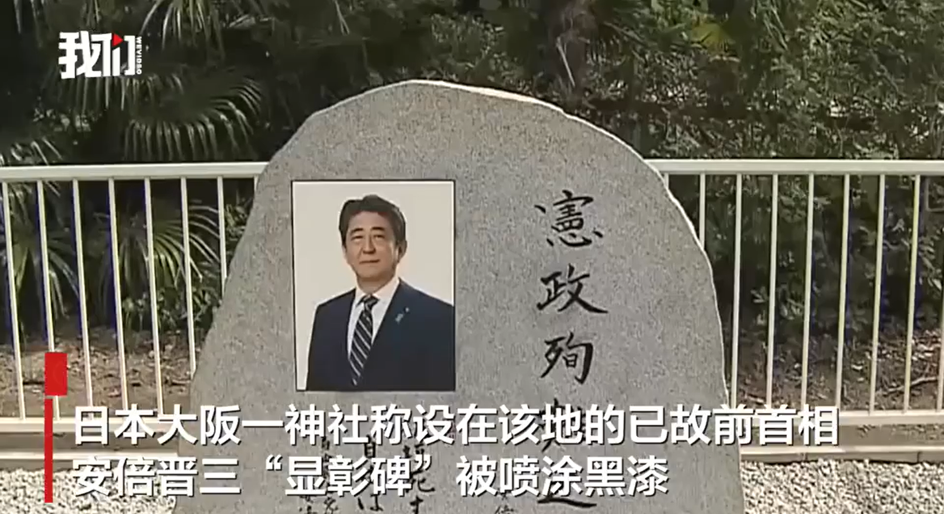 7月14日,日本大阪一神社称设在该地的已故前首相安倍晋三“显彰碑”被喷涂黑漆。碑上安倍晋三的照片被喷涂上所谓“诽谤语句”,目前已被擦除。