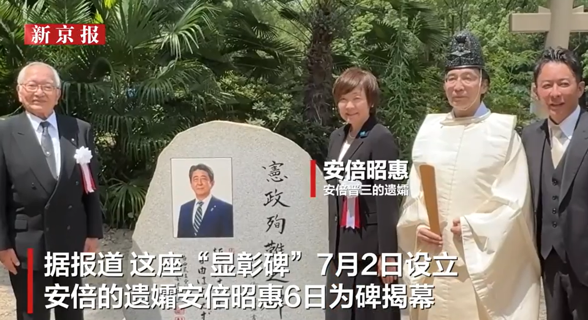 据报道,这座“显彰碑”7月2日设立,安倍的遗孀安倍昭惠6日为碑揭幕。安倍晋三2022年7月8日在街头演讲时遭枪击,经数小时抢救后不治身亡。