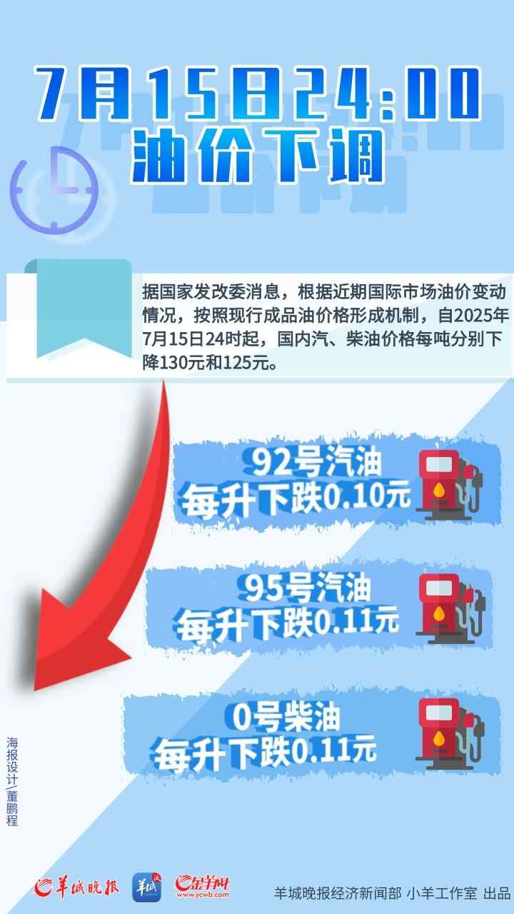 7月15日,羊城晚报记者从国家发改委官网获悉,根据近期国际市场油价变化情况,按照现行成品油价格形成机制,自2025年7月15日24时起,国内汽、柴油价格(标准品,下同)每吨分别下降130元和125元。折合升价92#汽油、95#汽油、0#柴油分别下调0.10元、0.11元、0.11元。