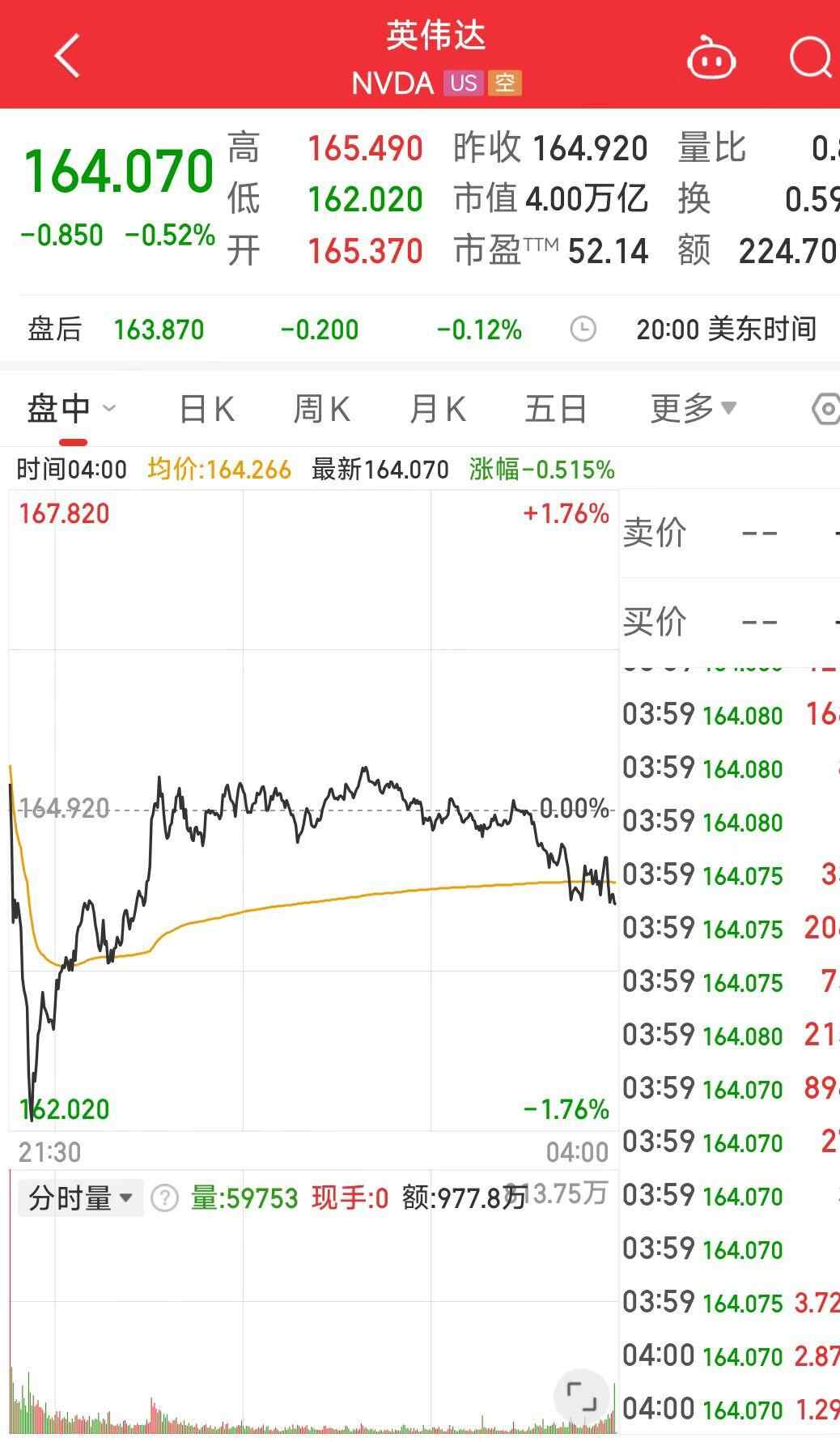 据澎湃新闻报道,受H20将重新开售以及推出全新GPU的消息影响,英伟达夜盘直线拉升涨近3%。7月14日,英伟达股价跌0.52%收于每股164.07美元,总市值4.00万亿美元。就在不久前,英伟达刚刚成为全球首家市值达到4万亿美元的公司。