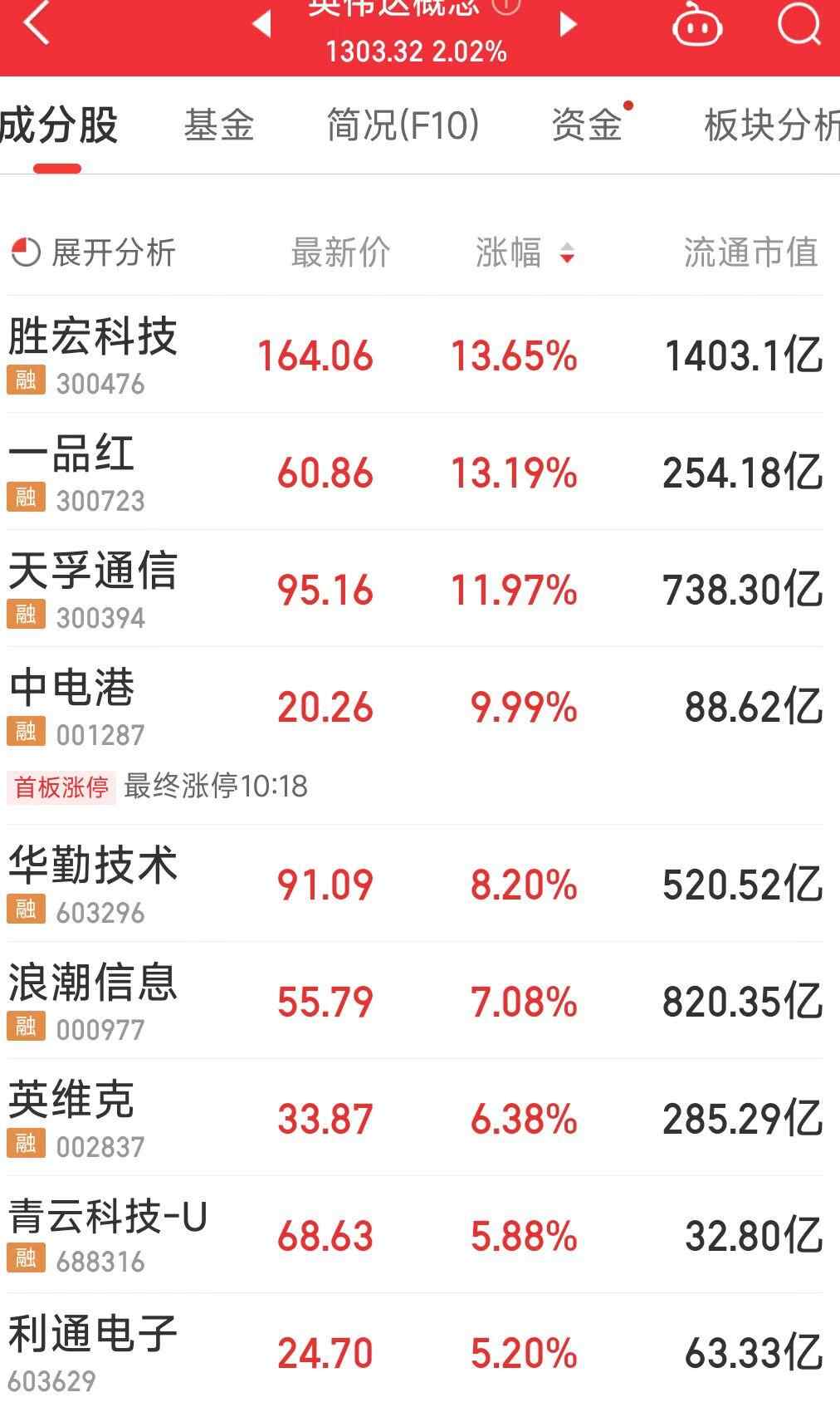 7月15日,A股英伟达概念表现活跃。截至收盘,胜宏科技创历史新高涨逾13%、一品红涨超13%、天孚通信涨超11%;中电港涨停,华勤技术涨超8%、浪潮信息涨约7%。