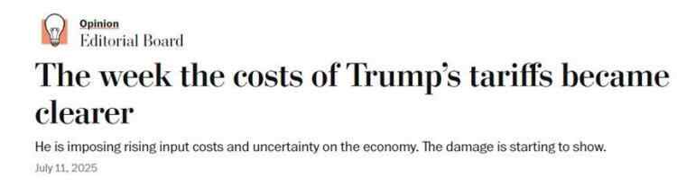 文章说,虽然特朗普推迟了关税实施的期限,但并没有豁免已实施的10%全面关税,也没有取消美国对钢铁等特定商品的关税。本月发布的数据显示,这些关税已开始对经济造成损害:进口“投入要素”(美国企业用于生产成品的商品)的成本正在飙升。今年1月至5月间,进口钢铁和铝材均价攀升近30%,而美国境内约半数铝材与四分之一钢材依赖进口;与此同时,纺织原料、皮革、橡胶及塑料制品的价格同样出现大幅攀升——而这些是未来物价上涨的先行指标。因此,特朗普的关税政策非但没能保护美国企业,反而似乎正在对这些产业造成冲击——尤其是高度依赖海外供应链的美国汽车制造业及其他相关产业。