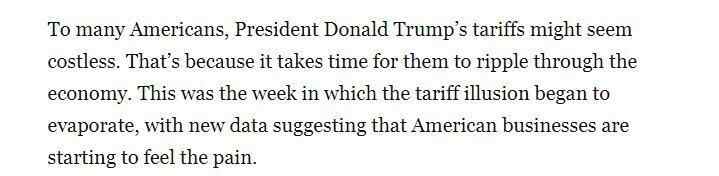 文章说,对许多美国人而言,特朗普总统的关税政策似乎毫无成本,其实这是因为关税对经济产生的连锁影响需要过一段时间才能显现。而在本周,这种似乎“毫无成本”的幻觉开始消散——新数据显示美国企业正开始感受到“切肤之痛”。