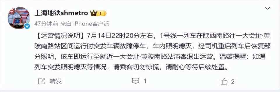 7月15日上午,上海申通地铁集团有限公司运营管理中心官方微博发布情况说明称,7月14日22时20分左右,1号线一列车在陕西南路往一大会址·黄陂南路站区间运行时突发车辆故障停车,车内照明熄灭,经司机重启列车后恢复部分照明,该车即运行至就近一大会址·黄陂南路站清客退出运营。