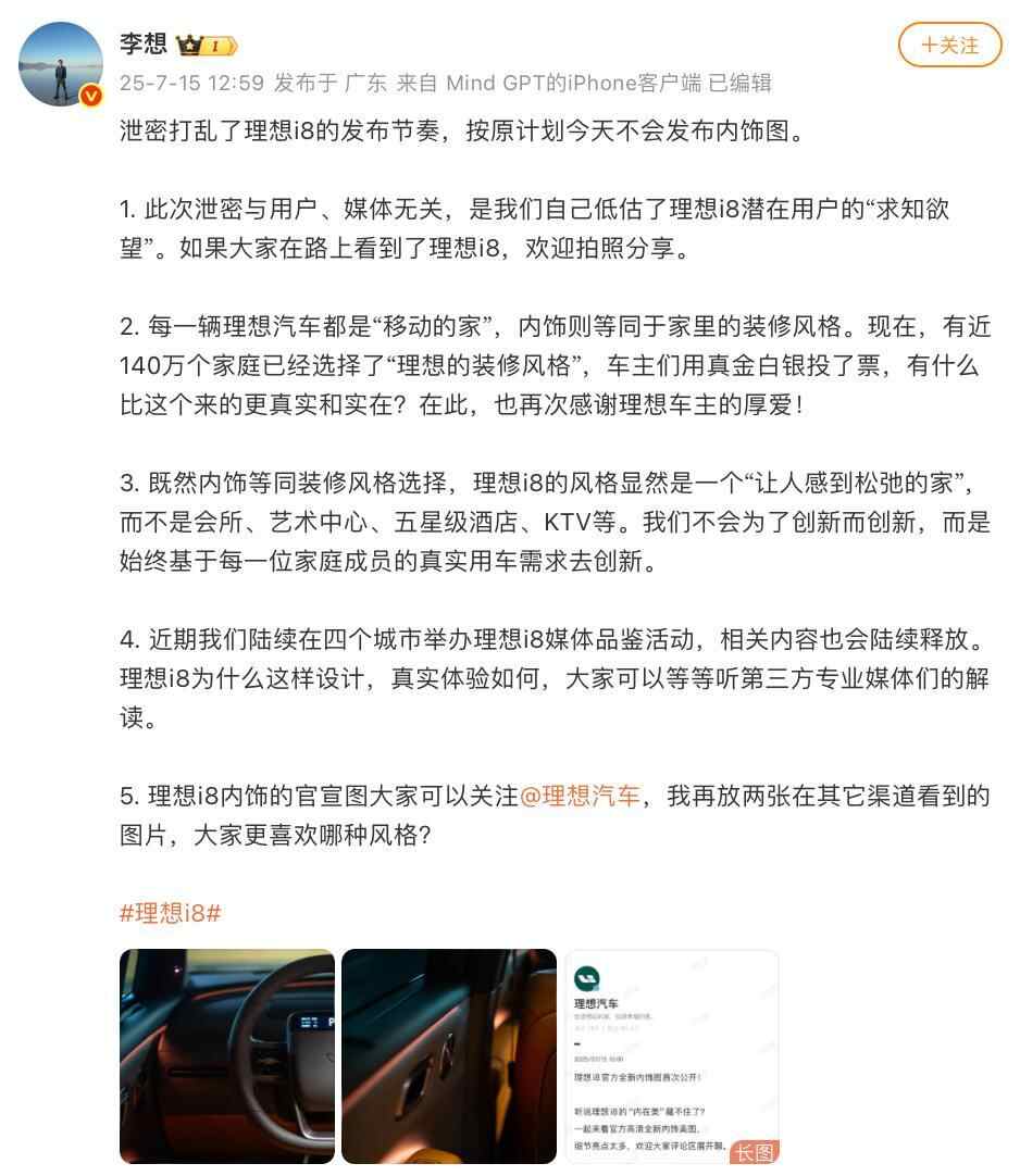 7月15日,理想汽车CEO李想发文称,“泄密打乱了理想i8的发布节奏,按原计划今天不会发布内饰图。此次泄密与用户、媒体无关,是我们自己低估了理想i8潜在用户的“求知欲望”。