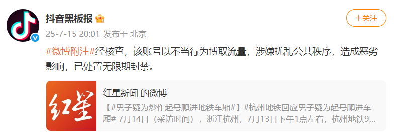 7月15日,@抖音黑板报 转发红星新闻该条动态并发文称:经核查,该账号以不当行为博取流量,涉嫌扰乱公共秩序,造成恶劣影响,已处置无限期封禁。
