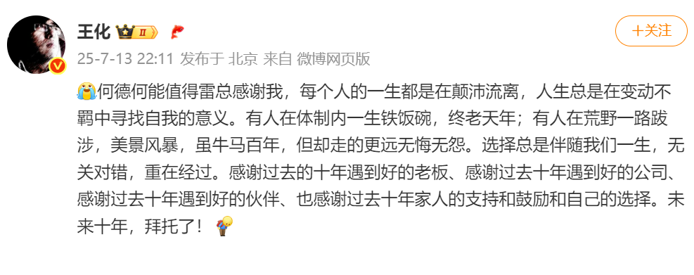 随后王化再发文:何德何能值得雷总感谢我,每个人的一生都是在颠沛流离,人生总是在变动不羁中寻找自我的意义。有人在体制内一生铁饭碗,终老天年;有人在荒野一路跋涉,美景风暴,虽牛马百年,但却走得更远无悔无怨。选择总是伴随我们一生,无关对错,重在经过。感谢过去的十年遇到好的老板、感谢过去十年遇到好的公司、感谢过去十年遇到好的伙伴、也感谢过去十年家人的支持和鼓励和自己的选择。未来十年,拜托了!