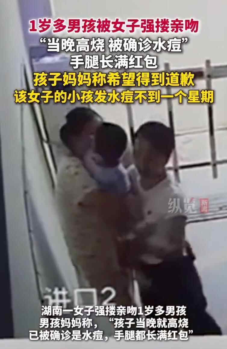 7月13日,湖南一女子强搂亲吻1岁多男孩,男孩的妈妈称“孩子当晚就高烧,已被确诊是水痘,手腿都长满红包。要求道歉时,没有得到正面回应。报了警,警察登门后也无果。”据男孩妈妈发帖称,“她(当事女子)小孩发水痘一个星期不到,小孩发烧刚从医院回来。”