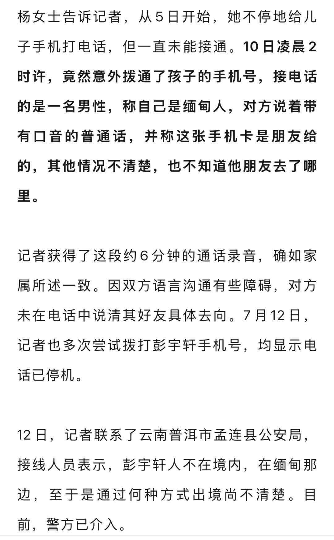 杨女士透露,10日凌晨2时许,她还意外拨通过儿子的手机,接电话的是一个缅甸人,对方称手机卡是别人给的,但未说明他儿子去向,此后再拨打就无法接通。目前,警方已介入。