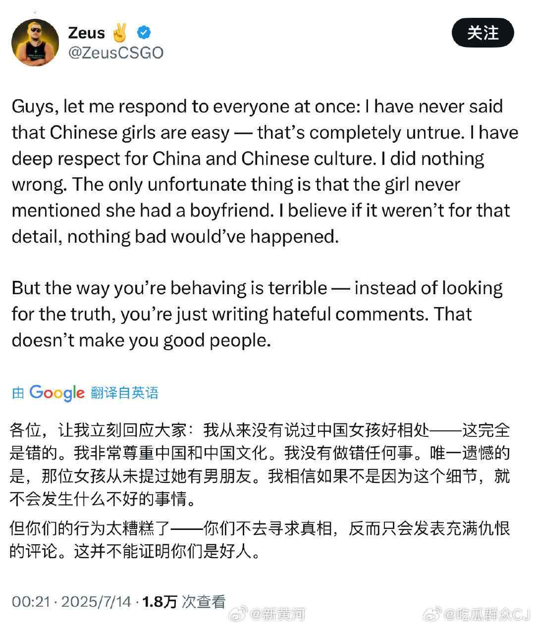 7月14日,Zeus在社交平台发文回应,他表示对此感到遗憾,自己没想过伤害任何人,并辟谣网传结婚生子传闻,希望能尽快结束此事,喊话网友停止仇恨言论。