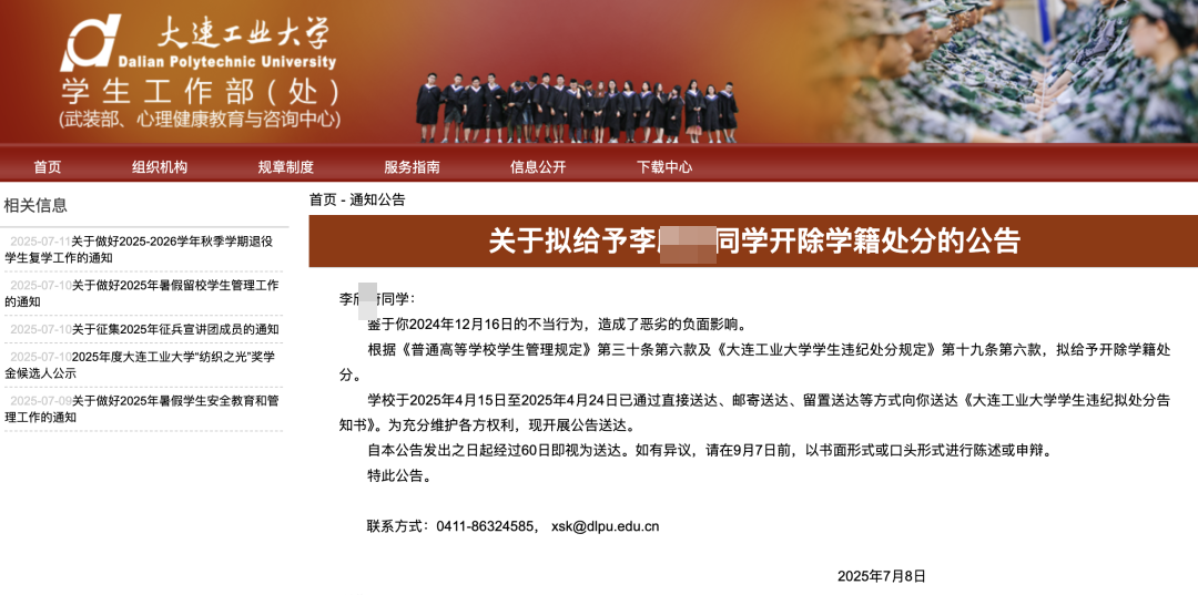 内容如下:李某某同学:鉴于你2024年12月16日的不当行为,造成了恶劣的负面影响。根据《普通高等学校学生管理规定》第三十条第六款及《大连工业大学学生违纪处分规定》第十九条第六款,拟给予开除学籍处分。