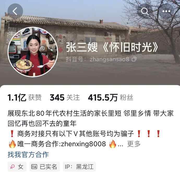 其社交账号显示,张三嫂《怀旧时光》在抖音拥有415万粉丝,获赞超1亿。其短视频内容多为“80年代家长里短”。