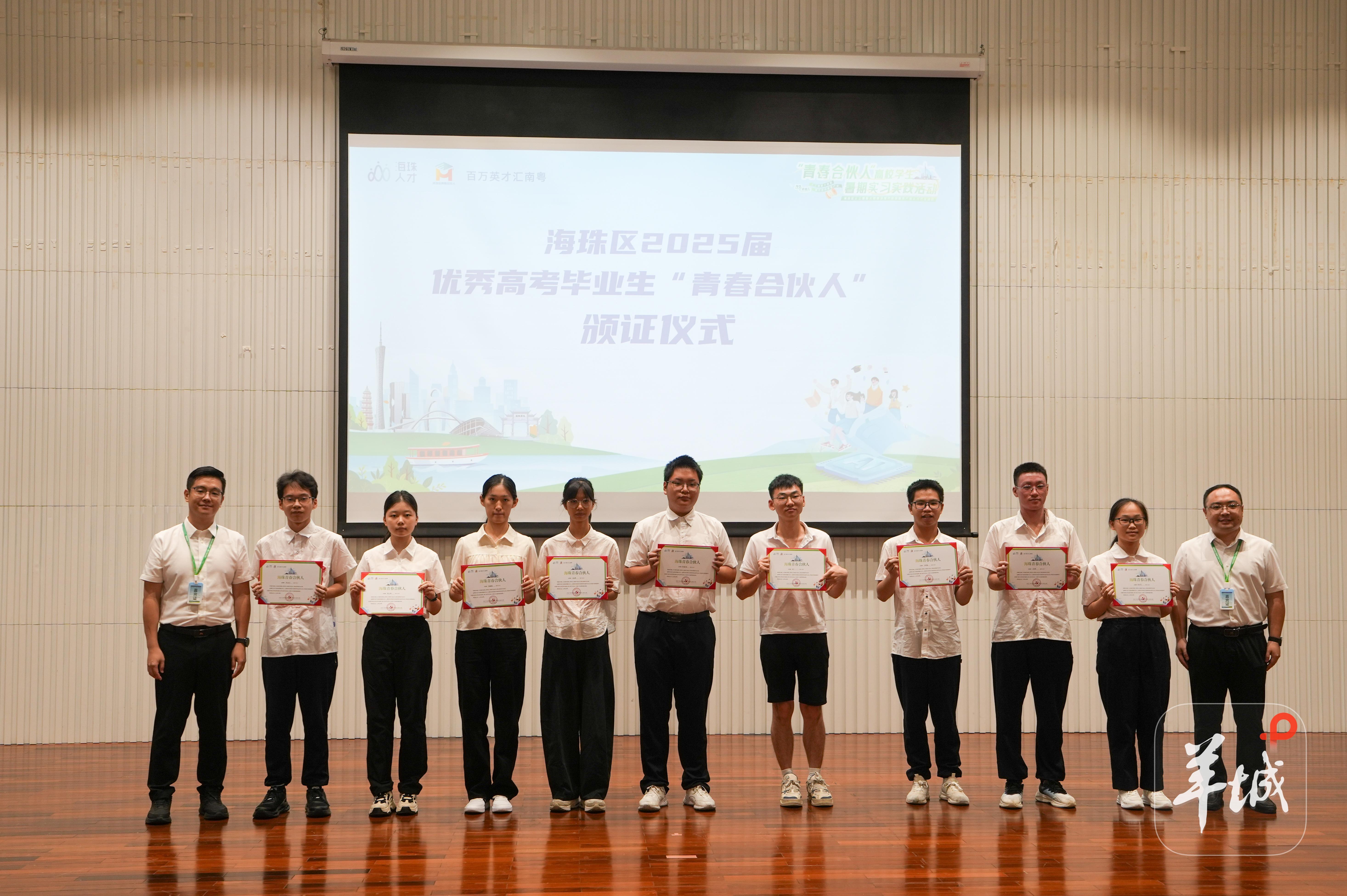 作为广州教育强区,海珠区不仅有丰富的高校资源,还有优质的中学资源。北京大学2025年“知行计划”地方党政机关见习实践广州海珠团团长连旭,初中和高中皆就读于海珠区的广州市第六中学。未来1个月除了在广州海珠实习,连旭和同学们还需要完成一份未来3到5年内海珠区急需人才的调研报告,“我希望通过自身努力,为培养我的海珠区做点什么。”在7月14日的启动仪式上,海珠区还为区内2025年高考优秀考生进行颁证鼓励。“我希望海珠区未来发展越来越好。”来自广州市第五中学的优秀高考生黄玥莹表示,她对人工智能很感兴趣,希望自己未来能够投身于海珠区的人工智能产业中。