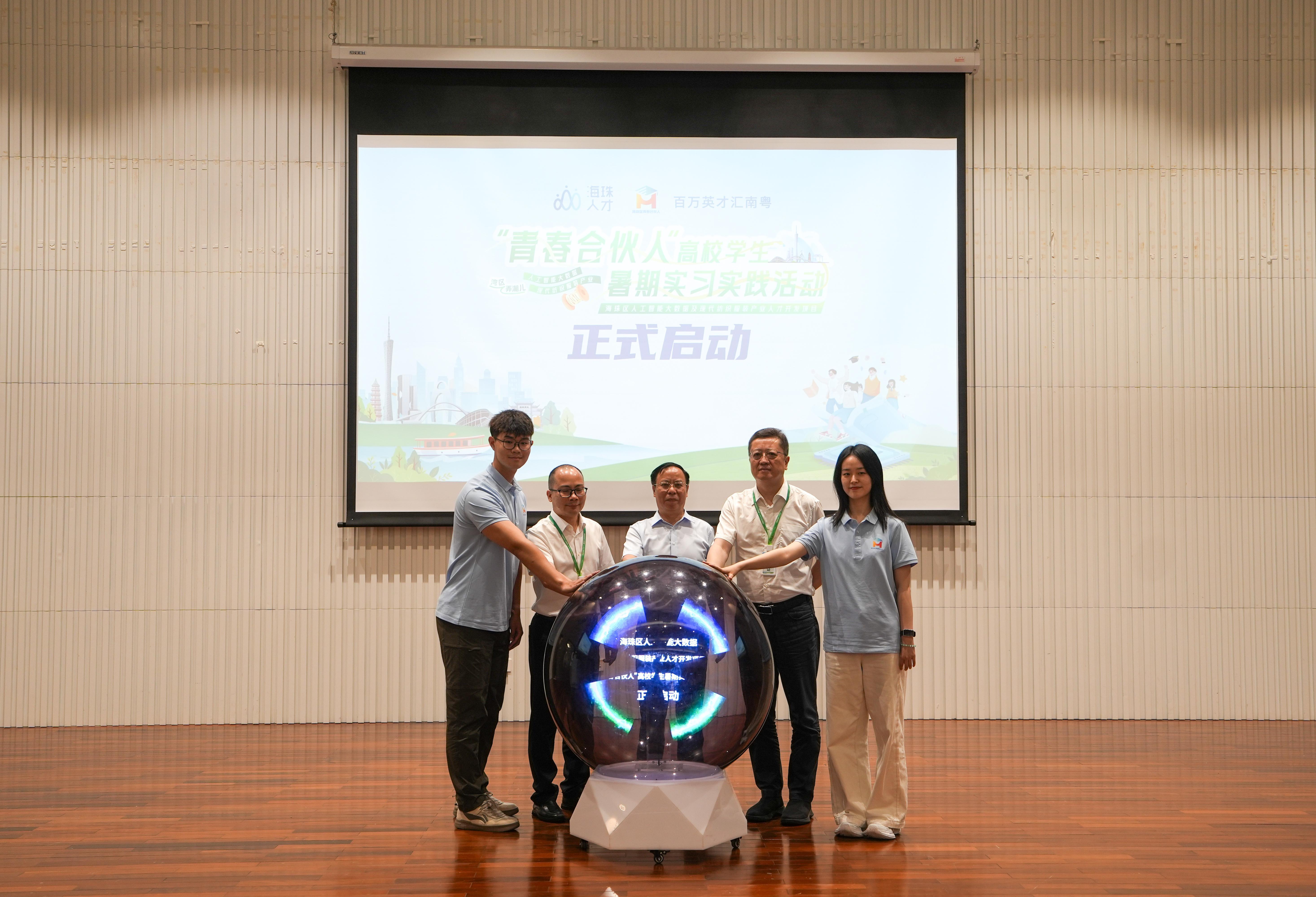 根据此前海珠区公布的情况,今年海珠区“青春合伙人” 实习实践活动,共设置了38个党政机关岗位和13个重点企业岗位,包括阿里巴巴研发工程师、三七互娱游戏系统策划、树根互联产品经理、云蝶科技副总裁助理等岗位,共向相关高校邀请到51名学生参加。在7月14日的启动仪式上,用人单位代表和学生代表,共同按下启动球启动实习实践活动,并在活动结束后共同前往相关单位开启实习实践之旅。