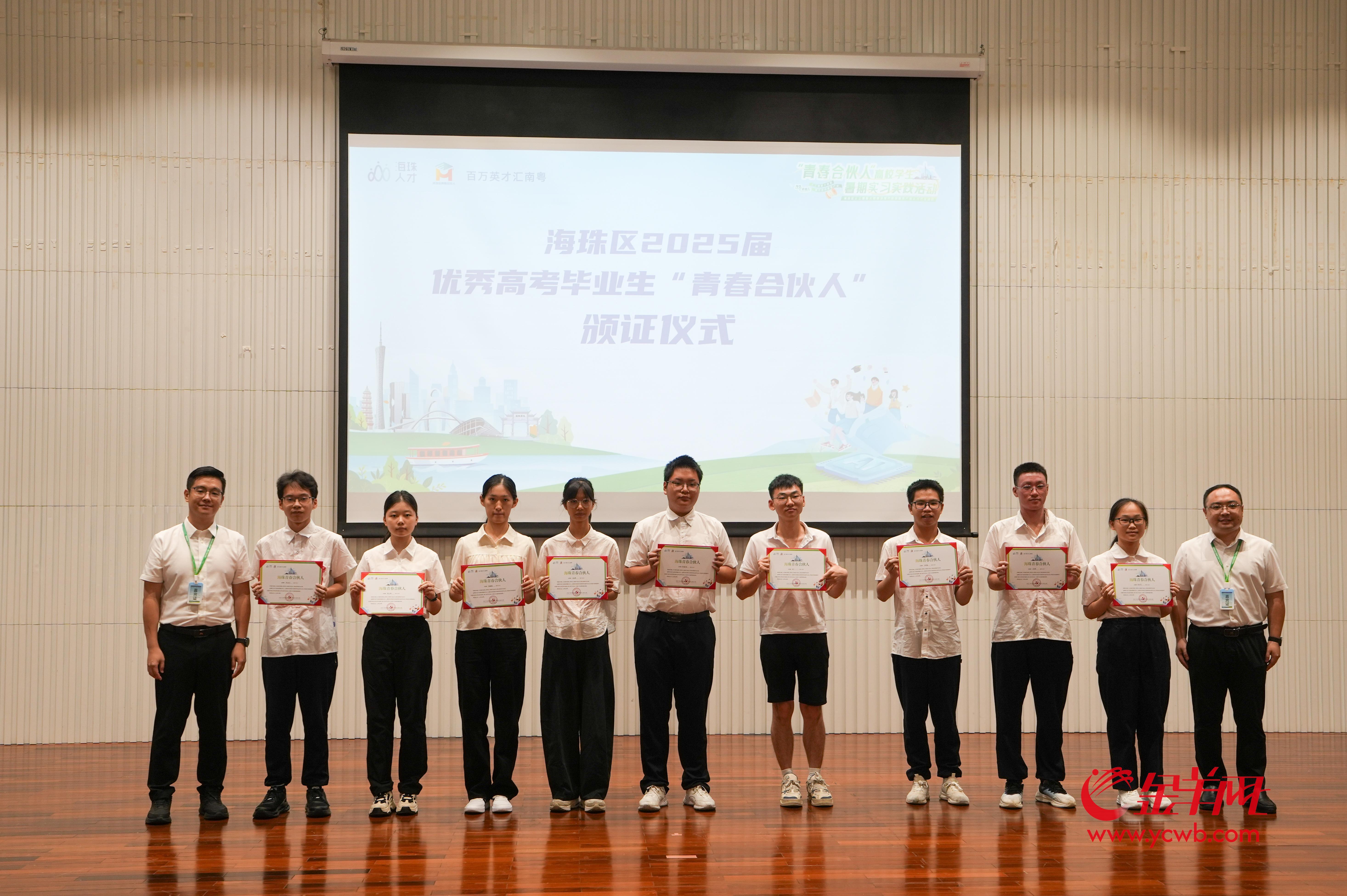 作为广州教育强区,海珠区不仅有丰富的高校资源,还有优质的中学资源。北京大学2025年“知行计划”地方党政机关见习实践广州海珠团团长连旭,初中和高中皆就读于海珠区的广州市第六中学。未来1个月除了在广州海珠实习,连旭和同学们还需要完成一份未来3到5年内海珠区急需人才的调研报告,“我希望通过自身努力,为培养我的海珠区做点什么。”在7月14日的启动仪式上,海珠区还为区内2025年高考优秀考生进行颁证鼓励。“我希望海珠区未来发展越来越好。”来自广州市第五中学的优秀高考生黄玥莹表示,她对人工智能很感兴趣,希望自己未来能够投身于海珠区的人工智能产业中。