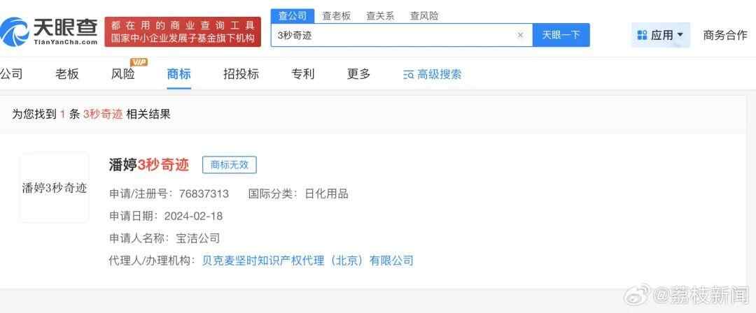天眼查知识产权信息显示,宝洁公司已申请注册“分钟奇迹”“3分钟奇迹”“潘婷3秒奇迹”“潘婷3分钟奇迹”商标,国际分类均为日化用品,除“潘婷3分钟奇迹”商标已注册成功外,“分钟奇迹”“3分钟奇迹”商标申请已被驳回,均处于无效状态。
