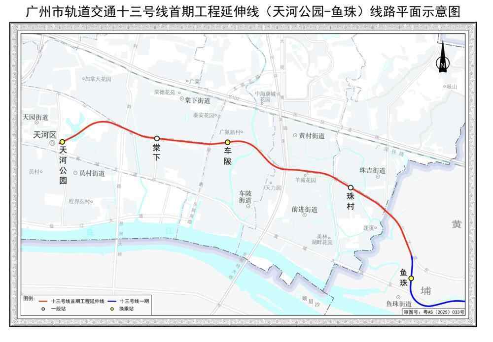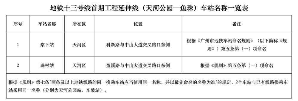 通告显示,地铁十三号线首期工程延伸线(天河公园-鱼珠)共设4个车站,其中2个车站与已有线路换乘车站采用同一名称(分别为天河公园站、车陂站),2个新命名车站分别为棠下站、珠村站。