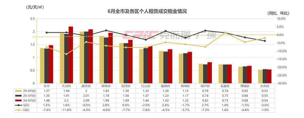 与此同时,6月广州个人租赁住房成交量16124间,环比上涨28.2%,成交坪效租金达1.37元/天/㎡,环比上涨1.5%,其中,海珠、番禺、南沙三区租金环比涨幅超2%。
