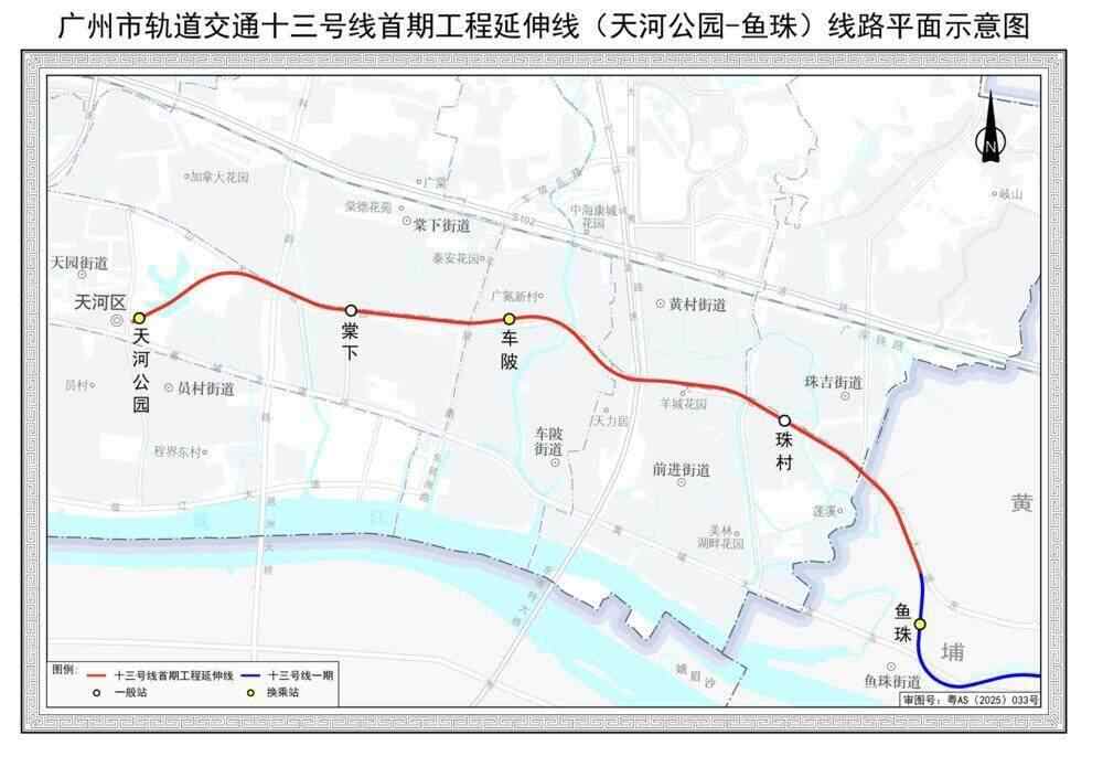 通告显示,地铁十三号线首期工程延伸线(天河公园-鱼珠)共设4个车站,其中2个车站与已有线路换乘车站采用同一名称(分别为天河公园站、车陂站),2个新命名车站分别为棠下站、珠村站。