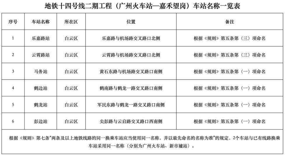 十四号线二期工程(广州火车站-嘉禾望岗)共设8个车站,其中2个车站与已有线路换乘车站采用同一名称(分别为广州火车站、新市墟站),6个新命名车站分别为乐嘉路站、云霄路站、马务站、鹤边站、鹤龙站、彭边站。