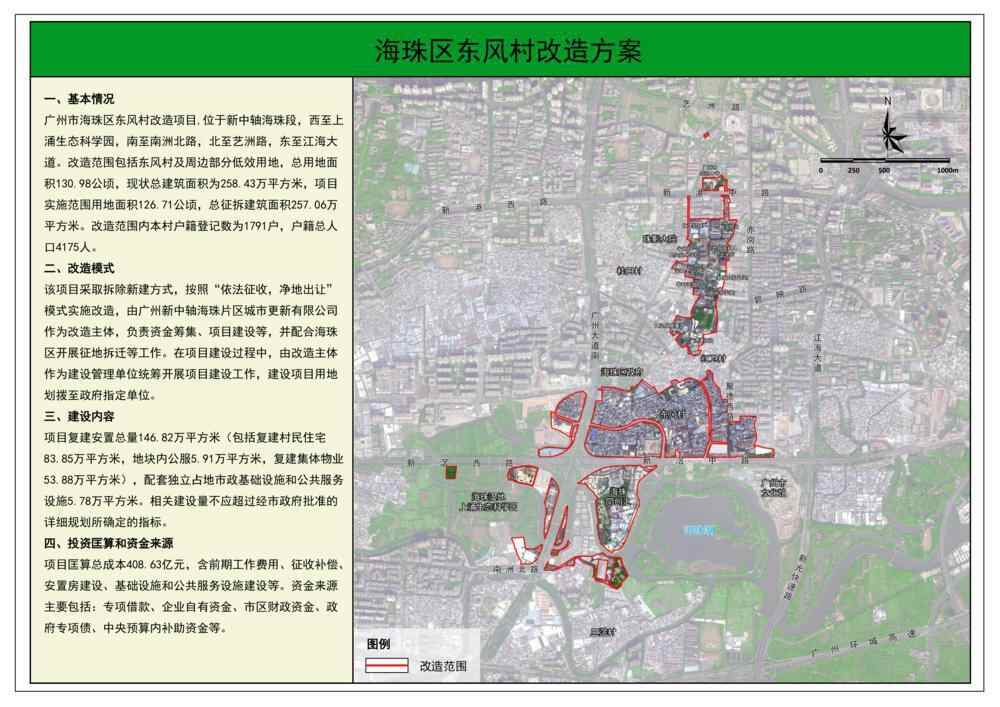 东风村改造项目西至上涌生态科学园,南至南洲北路,北至艺洲路,东至江海大道,改造范围包括东风村及周边部分低效用地,现状总建筑面积为258.43万平方米,总征拆建筑面积257.06万平方米。方案显示,目前已拆除的新港商业城、广州市纺织中专以及正在征收的畅流工业园、广州市轻工职业学校等赤岗、江海街道所属地段均为东风村改造项目一部分。